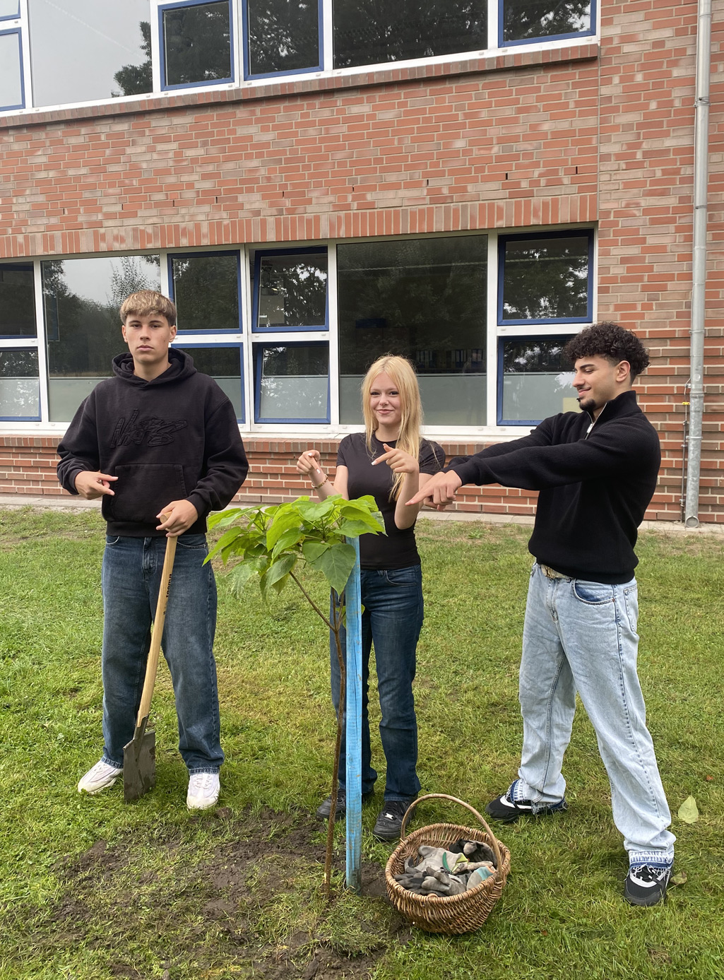 Im Beisein von Schulleiter Daniel Helming und im Namen der ganzen Schulgemeinschaft überreichten die Schülervertreter Asen Hristov (r.), Aliah Kus, Leo Mücke (hinten v.r.) und Daria Ramo (l.) die symbolischen Schecks an Swetlana Nei und Ralf Middendorf. | Foto: Stephan Beermann