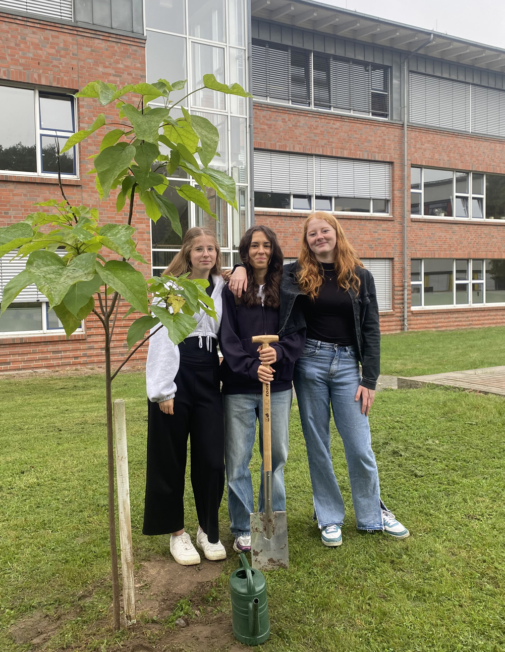 Im Beisein von Schulleiter Daniel Helming und im Namen der ganzen Schulgemeinschaft überreichten die Schülervertreter Asen Hristov (r.), Aliah Kus, Leo Mücke (hinten v.r.) und Daria Ramo (l.) die symbolischen Schecks an Swetlana Nei und Ralf Middendorf. | Foto: Stephan Beermann
